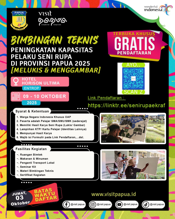 Mari Ikuti Kelas Bimbingan Teknis (Bimtek) Seni Rupa Tahun 2025 yang dilaksanakan Dinas kebudayaan dan Pariwisata Provinsi Papua melalui Bidang Ekonomi Kreatif, merupakan salah satu kegiatan yang bersumber dari dana Otonomi Khusus (Otsus) 1% Provinsi Papua dimana dana Otsus ini diperuntukan untuk kesejahteraan dan pengembangan ekonomi masyarakat Orang Asli Papua (OAP) di bidang pendidikan, ekonomi dan pengembangan sumber daya manusia OAP.